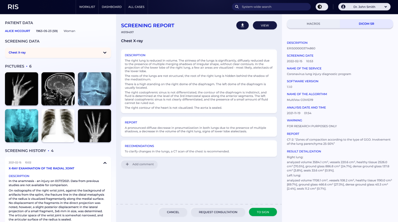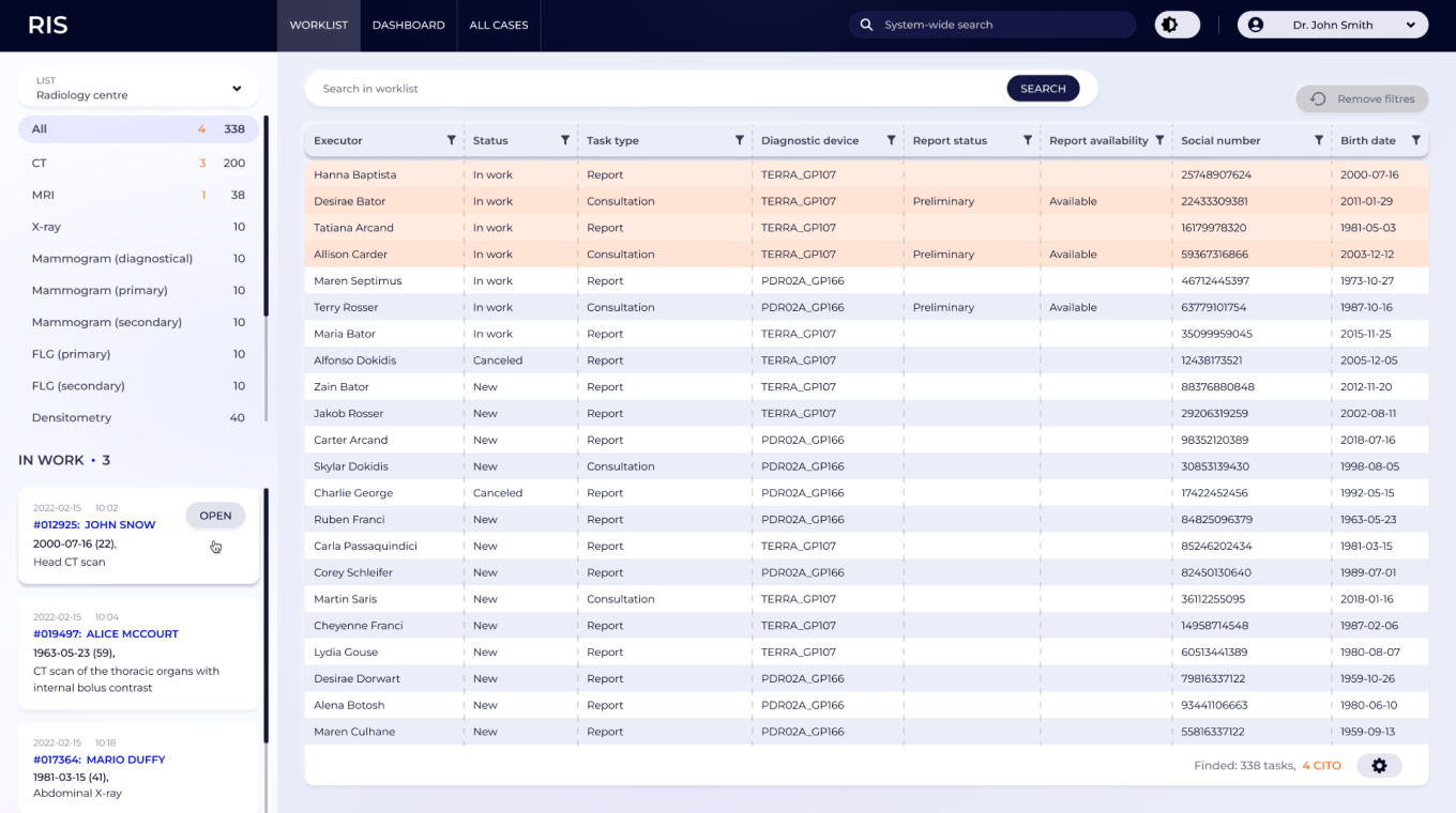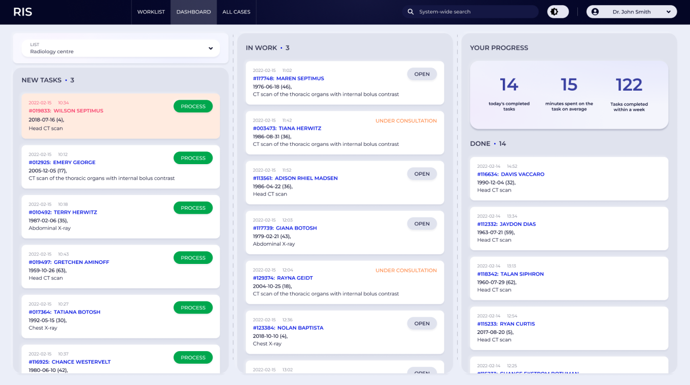 Through my research I realised that the vast majority of old-school RIS systems use a dark interface, the reason being that radiologists used to work with images that required complete darkness. But thanks to technological advances in digital imagery, staff now work in bright lighting. I decided to create both dark and light themes to give each user a choice: they could keep the dark version or switch to a light theme for consistency with the other software they use.